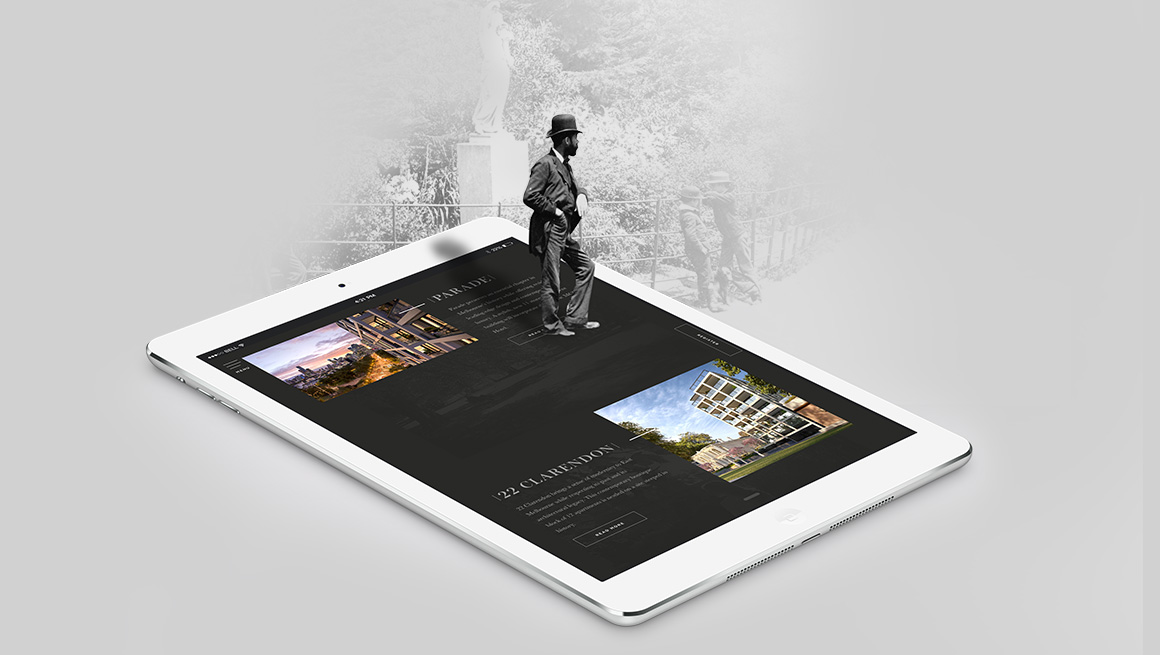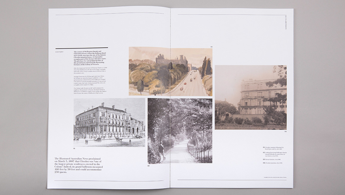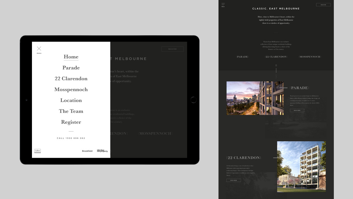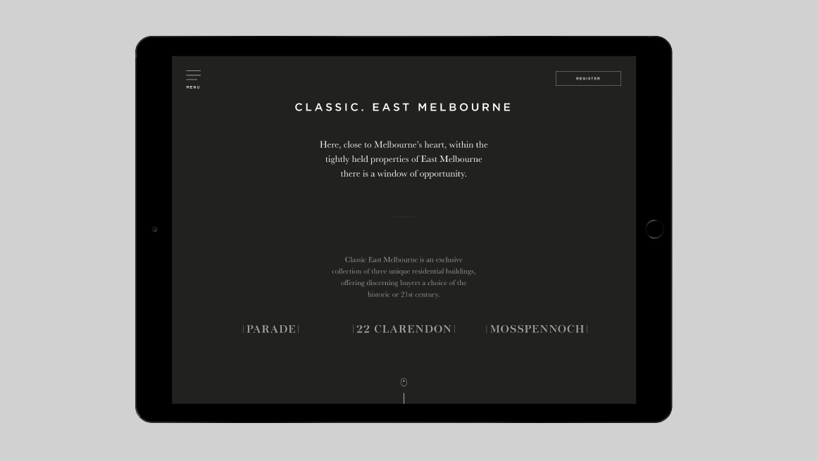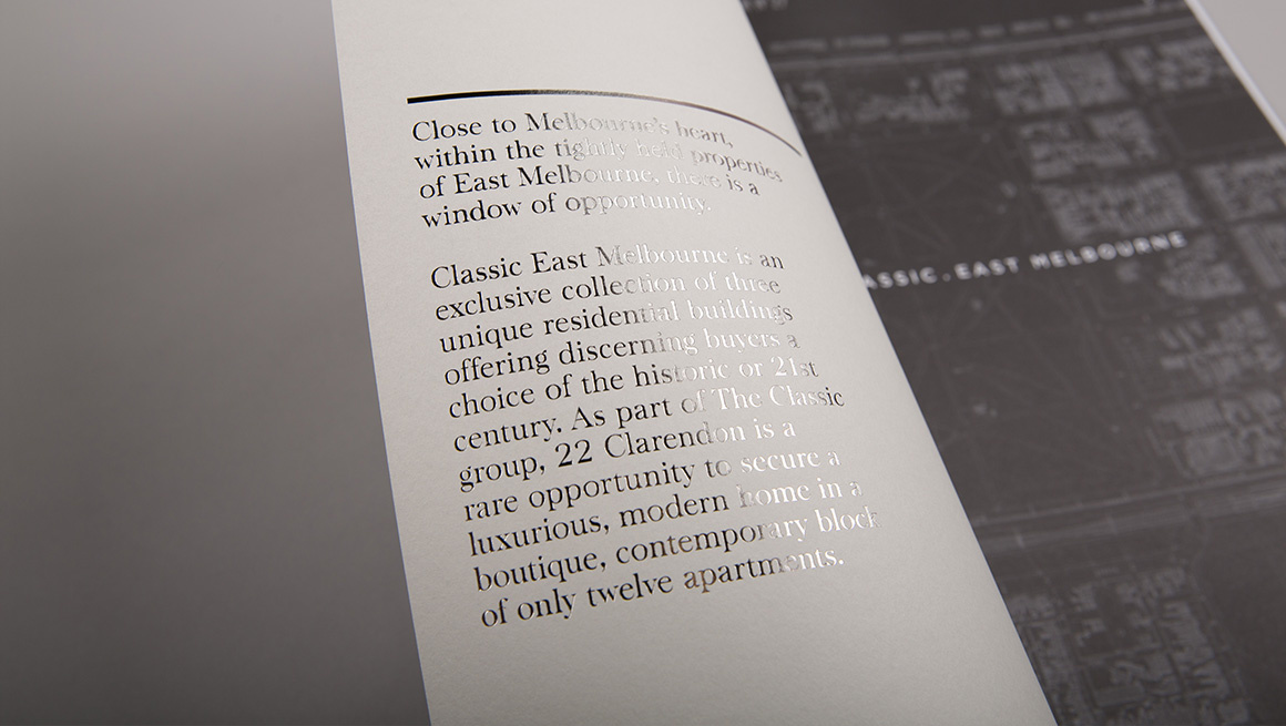 The sales strategy had to allow for the sale of three different residential products at the same time. An umbrella brand ‘Classic. East Melbourne’ was created to showcase Mosspennoch, 22 Clarendon and Parade buildings. Each product was given a complimentary identity, so together they formed a family of products on offer. Each product provided a different level in size and cost. Material focussed on bespoke architectural details and the tranquil green spaces on the doorstep of the Melbourne CBD.