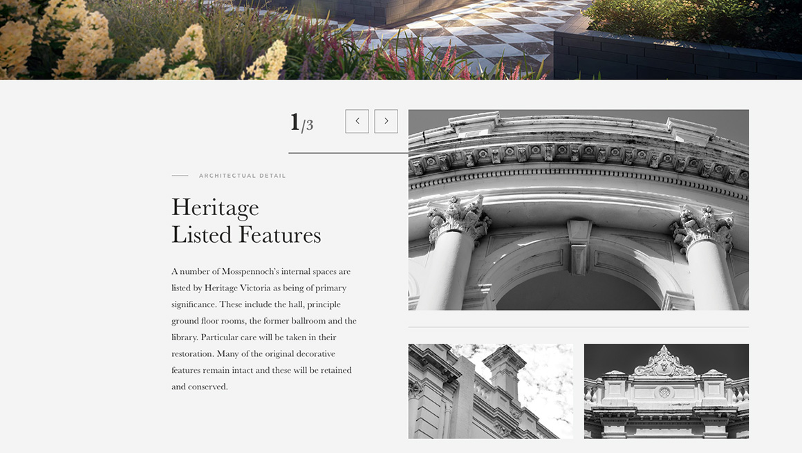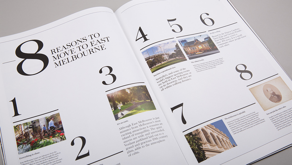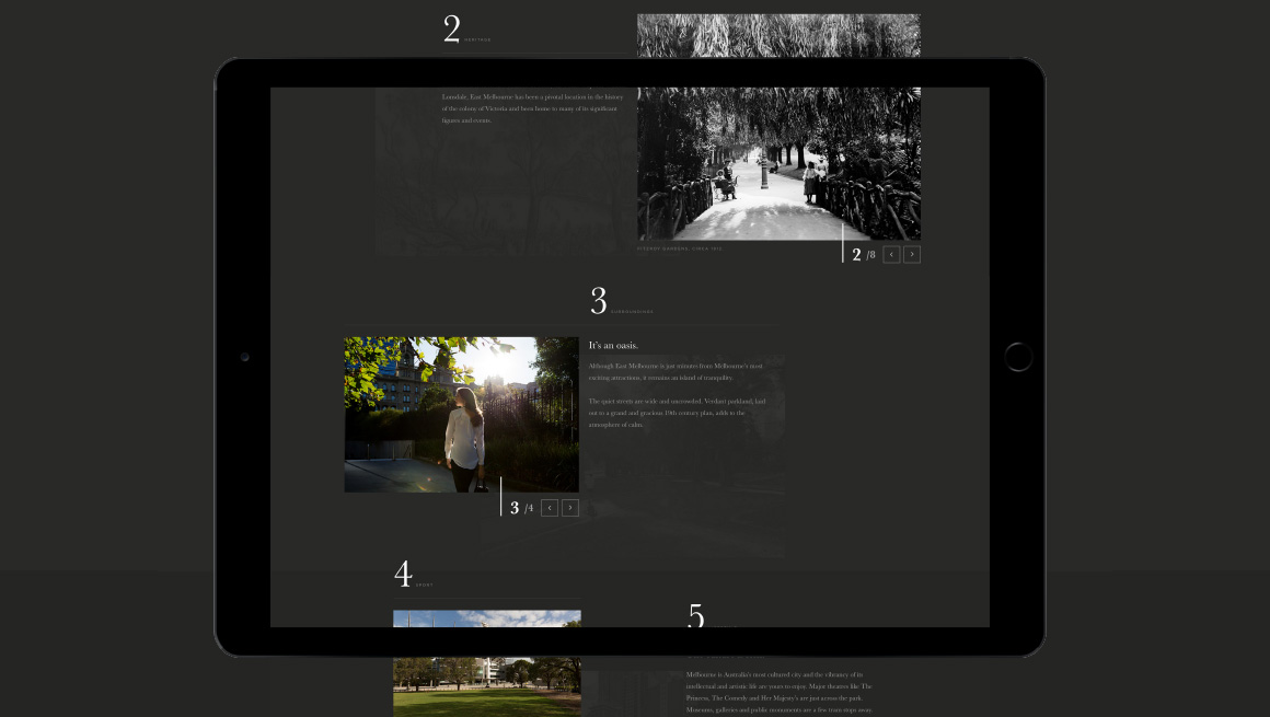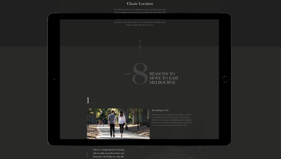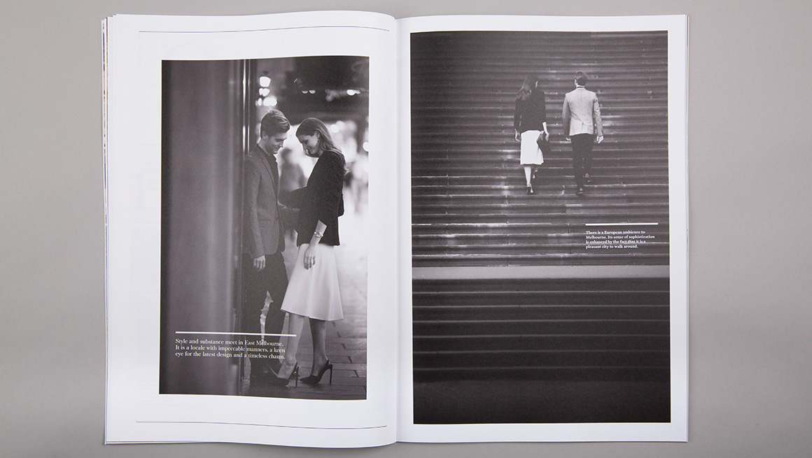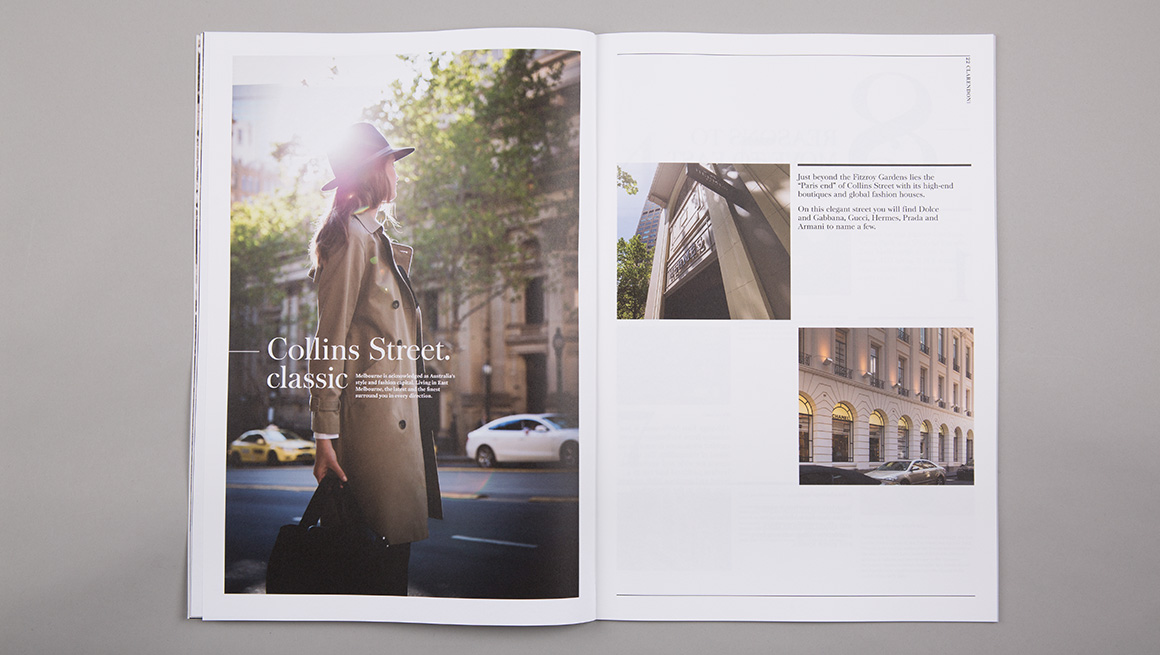 The sales strategy had to allow for the sale of three different residential products at the same time. An umbrella brand ‘Classic. East Melbourne’ was created to showcase Mosspennoch, 22 Clarendon and Parade buildings. Each product was given a complimentary identity, so together they formed a family of products on offer. Each product provided a different level in size and cost. Material focussed on bespoke architectural details and the tranquil green spaces on the doorstep of the Melbourne CBD.